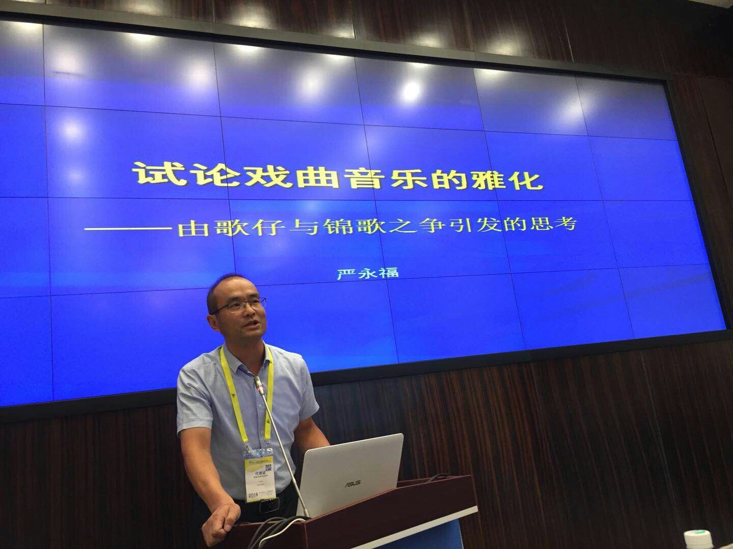2018年7月25日至28日,亚太民族音乐学会2018年会暨中国-东盟民族音乐文化教育研讨会在贵阳国际生态会议中心举行。公司音乐学系副主任严永福博士应邀赴筑参加了此次学术盛会,并在会议现场做了题为《试论戏曲音乐的雅化》的演讲。永福博士从研究视角与研究缘起,“歌仔”与“锦歌”争议的本质,雅化历程中歌仔音乐形态的变化,以及戏曲音乐“雅化”背后的社会文化隐喻等几方面向与会专家学者做了阐述汇报,并回答了与会者的提问。