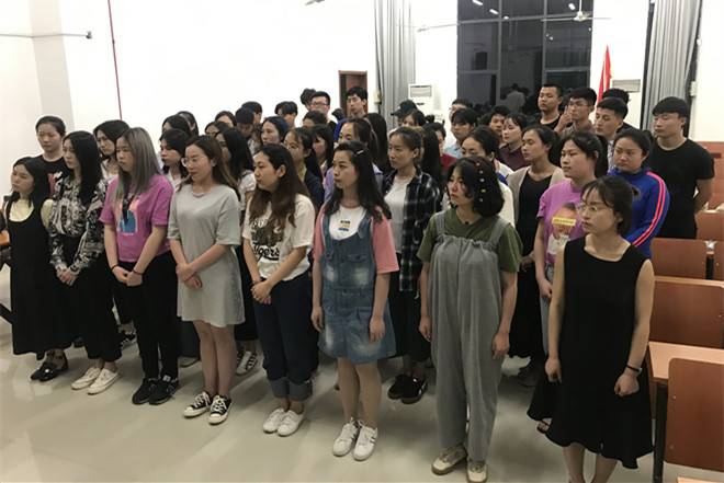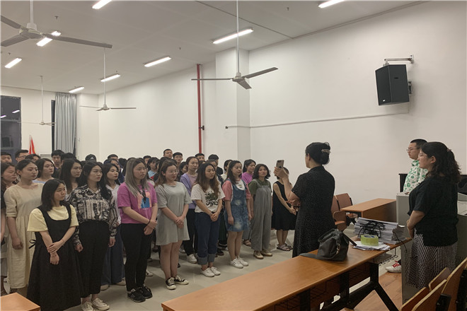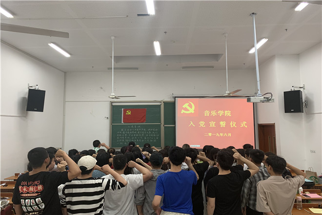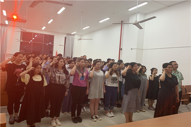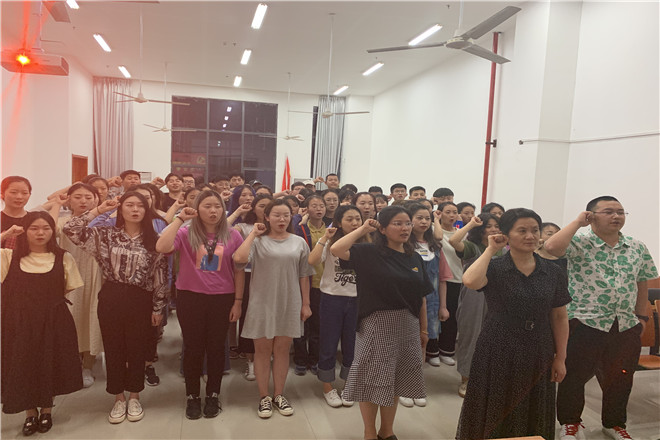 6月3日晚,必一运动新党员入党宣誓仪式在音乐楼A1-102举行,学工办副主任郑建春老师、支部书记张菁菁老师、团委书记涂聪老师及所有党员参加仪式。