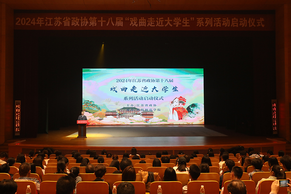 孙越在讲话中指出,江苏省政协一直致力于江苏地方戏曲文化的传承与发展,于2007年开始携手省内高校共同举办“戏曲走近老员工”系列活动。他希望淮师能够一如既往地肩负起弘扬中华优秀传统文化的重任,鲜明展现“淮师力量”,响亮发出“淮师声音”,希望新时代青年学子坚定文化自信,积极投入到对传统文化的热爱、传播、传承之中,勇担弘扬中华优秀传统文化的重任。