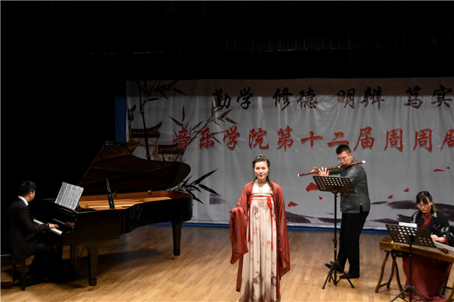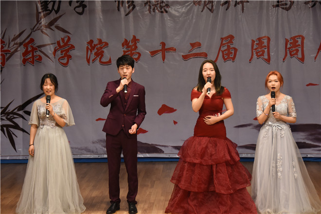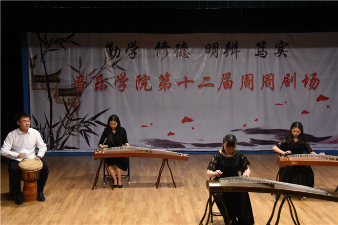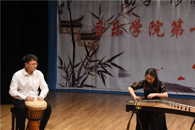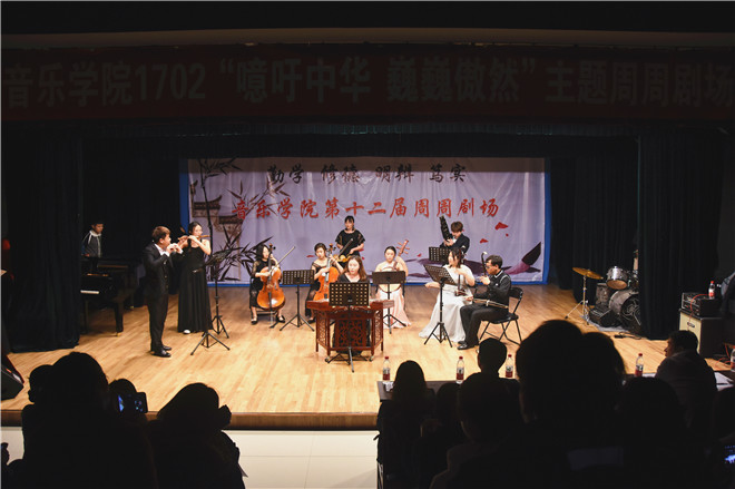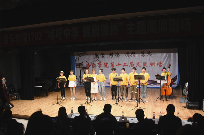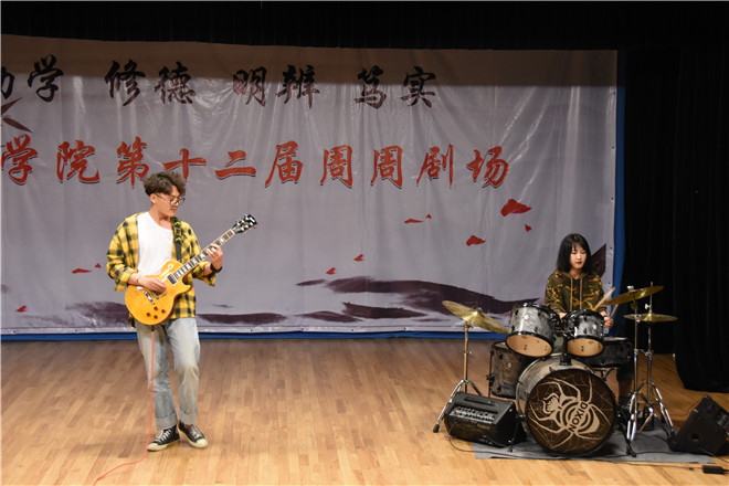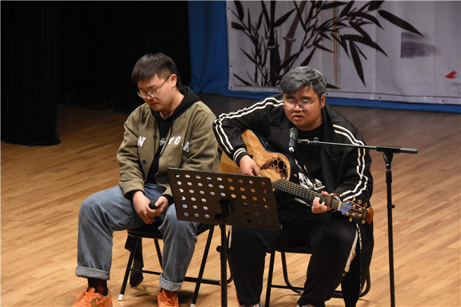花儿正盛开,月亮正圆满。一首民乐合奏《花好月圆》拉开本次演出的帷幕。岁月流转,时光荏苒,拼搏进取的正能量始终在一代代青年人心中澎湃激昂。韩思远、唐小博两位同学带来的歌曲《不忘初心》感染了在坐的每个人。回首硝烟弥漫的岁月,无数英雄浴血奋战,七十年披荆斩棘,才换来我们今天的美好生活,由李子轩、王荣美等同学带来的小合唱《同一首歌》唱出了七十年荆棘岁月。接着严润章同学带来的《我的祖国妈妈》,深切的表达出对祖国母亲的热爱和祝福。高若男等同学带来的古筝合奏《蝴蝶与蓝》,让人们随着春风的洗礼感受到大自然的宁静。梁泓阳同学带来的《桃花红杏花白》曲调优美,感情真挚。姚亦徐同学带来的《西域随想》将在座的观众都带入到西域的万般旖旎之中。随后,刘士豪同学带来的《摇滚卡农》,柔和与失真碰撞,使本次演出达到了高潮。陈俊苍,程超等同学带来的无伴奏合唱《柠檬树》将人声转换为了乐器,浑然天成,在场的观众都体会到了和谐之美。由袁祎锟同学带来的民谣歌曲《不待》,不仅给观众带来听觉上的冲击还有心灵上的巨大思考性。