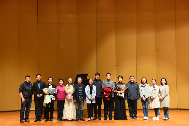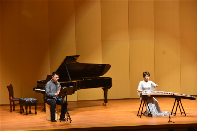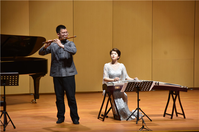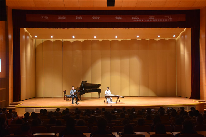 随着两位同学的深情演奏,也将本场音乐会推向高潮。接着由來锦文同学带来的独奏曲《溟山》,该曲子用湘西地方音乐素材,运用较为前卫的创作手法谱成的一首古筝作品。随着來锦文同学手指尖的不停弹奏,音符不断跳动,感染了在场的所有听众。征徒出灞涘,回首伤如何。故人云雨散,满目山川多。行车无停轨,流景同迅波。前欢渐成昔,感叹益劳歌。由刘莹玉和兰佳鑫同学带来的钢琴竹笛二重奏《灞桥》将在场所有人都带到了奇妙的意境。最后一首《临安遗恨》在朱博文和來锦文两位同学的演绎之中,将南宋民族英雄岳飞在当时入狱时对家人的思念,对自己精忠报国却无门可投的情感充分表达了出来。