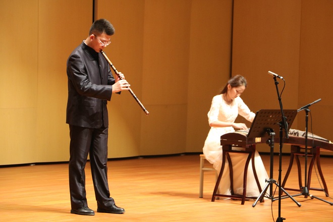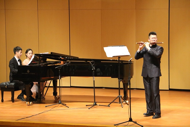 本次音乐会共分为上下两半场,上半场为四首竹笛独奏。一曲《淮海情》表达了对淮海大地秀美风景的赞美,展现对淮海大地未来的无限憧憬。汇聚了秦腔、碗碗腔、眉户戏等地方戏曲音乐素材写作而成的《秦川倩》,被兰家鑫演绎的淋漓尽致。“越王勾践破吴归,义士还家尽锦衣。宫女如花满春殿,只今惟有鹧鸪飞。”兰家鑫把乐曲《鹧鸪飞》演绎的快慢有致,强弱对比分明,观众似乎看到一只在天空尽情翱翔,时远时近,忽高忽低的鹧鸪鸟从他的乐曲中飞出来。《五梆子》的粗犷豪爽、热情奔放,感染了在座的所有人。
