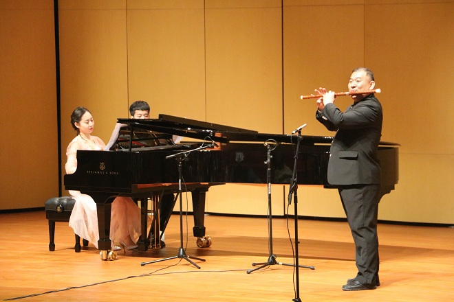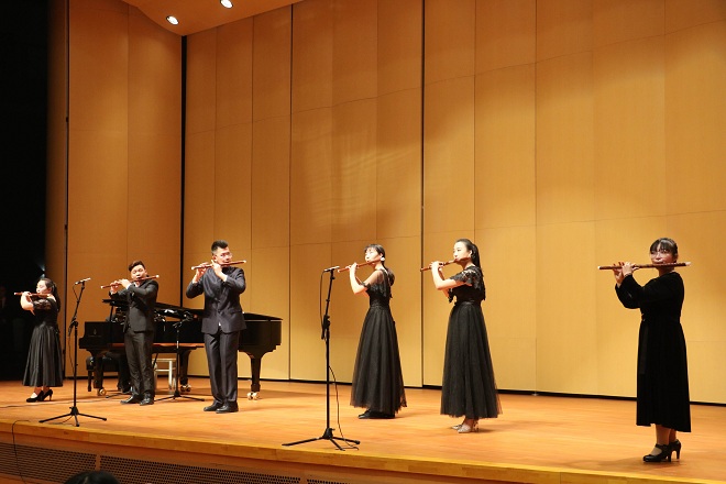 下半场为兰家鑫和同学,以及导师张志刚共同为大家演奏的五首乐曲。首先是由导师张志刚为大家带来的乐曲《春潮》,笛子连绵的波浪式律动和号子般的音调相结合,勾勒出船影叠叠破浪捕鱼的繁忙景象。一曲《姑苏行》如同一幅描绘江南美景的水墨丹青,带我们走进别样的意境。古曲《妆台秋思》取材于昭君出塞的故事,后改编为萧独奏曲、古筝曲版本。有浓郁地方特色的乐曲——《陕北四章》,表达对古老中国西部民间音乐的思索。最后一首曲子《走进快活岭》运用跳动的吐音等技巧充分表达脚下轻快,心旷神怡的感受。