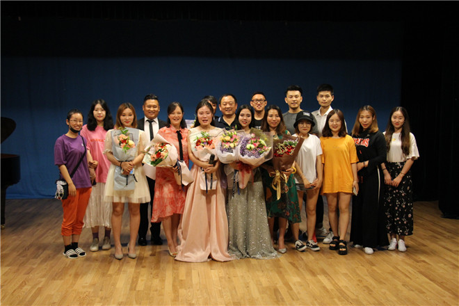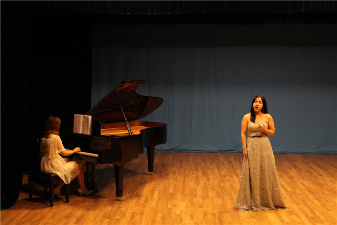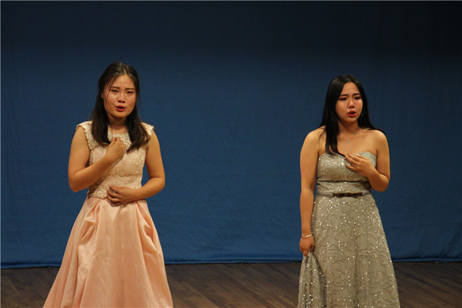 下半场为杨迪带来的两首声乐独唱和胡琴子带来的三首声乐独唱,以及两人的一首合唱。当杨迪演唱的《紫藤花》和《风萧瑟》对上胡琴子演唱的《芦花》和《牧笛》,歌剧、民歌、哈萨克风格的花腔女高音交织在一起,竟毫无违和感。胡琴子演唱的《火把节的欢乐》,把整场晚会推入了高潮。两人以歌传情,她们把想对老师说的话融入了《报答》这首歌中:是你教我成人,付出多少苦累,想起你的情我就心潮难平,想起你的爱我就饱含热泪。