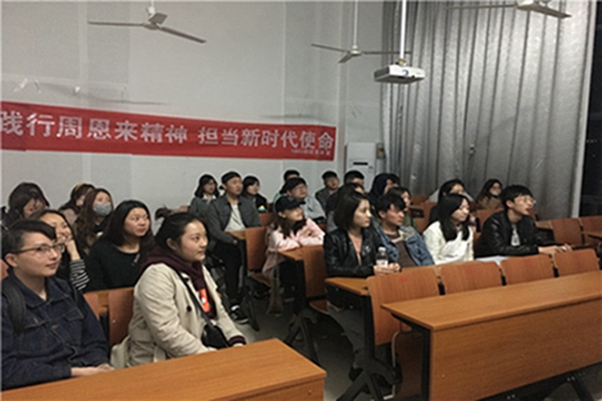 活动伊始,首先由丁子林带领大家观看周恩来系列影片——《周恩来的四个昼夜》。其次,为大家讲述了关于恩来的小故事,使班级同学得以从不同的角度了解恩来,学习恩来。活动的最后,部分班级同学积极的发表了对此次活动的意见和看法,并积极主动的提出要亲手书写观后感。