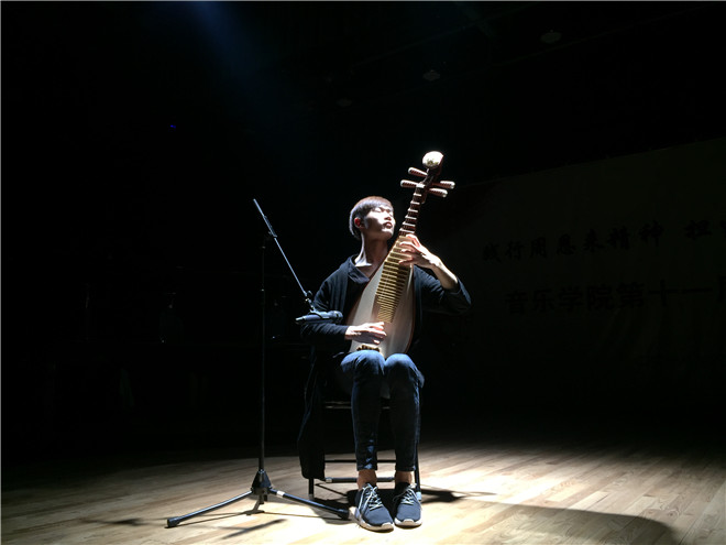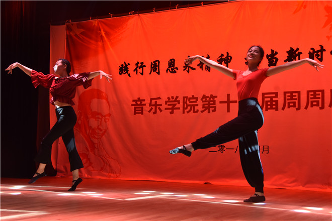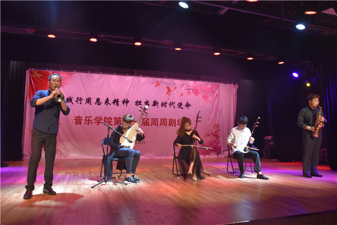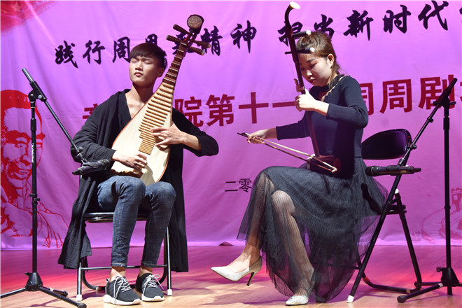 由徐靖宇、崔志杰同学等人带来的器乐合奏《北京一夜》,曲势大气,恢弘磅礴,曲调欢快,给人留下了深刻印象。刘欣然同学等人带来的朗诵《从梦想开始的地方》,带着对梦想的追求,来到了淮师,梦想是美好的,青春是激昂的,充满感情的朗诵给人们充分诠释了青春的意义。而接下来由辛昱林同学带来的钢琴独奏《彩云追月》,以其前后强烈的反差,以轻快独特的风格和富有民族色彩旋律节奏,给人以美好的遐想。李明、李泽轩同学带来的说唱《loving for north》两个人的激情对唱将此次演出送上了高潮。由闫如玉、刘春丽同学带来的舞蹈《九儿》以优美舞姿与婉转歌声的完美组合,给观众留下来不可磨灭的印象。李泽轩等同学带来的原创歌曲《这盛世如你所愿》,更是充分体现了本次周周剧场的主题,以大气磅礴的曲调,体现了人们对美好生活的向往和对国家的热爱。王飞宇同学带来的原创琵琶独奏《旌越春秋》,激昂婉转,是作曲者思宇同学怀揣着对周恩来总理的怀念之情和对未来的美好向往所谱,王飞宇同学将琵琶婉转和激昂的声音,通过自己熟练的演奏技巧演奏了出来,给全场的人员留下了极其深刻的印象