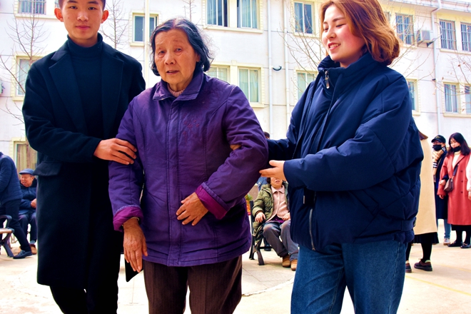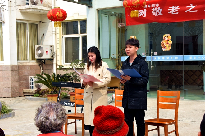 演出结束后,同学们又开展了义务大扫除活动。义务大扫除结束后,志愿者搀扶着老人在院子里散步,并给老人献上自己精心准备的歌谣,勾起老人对年轻时光的追忆。活动最后,志愿者们与老人们合影留念。