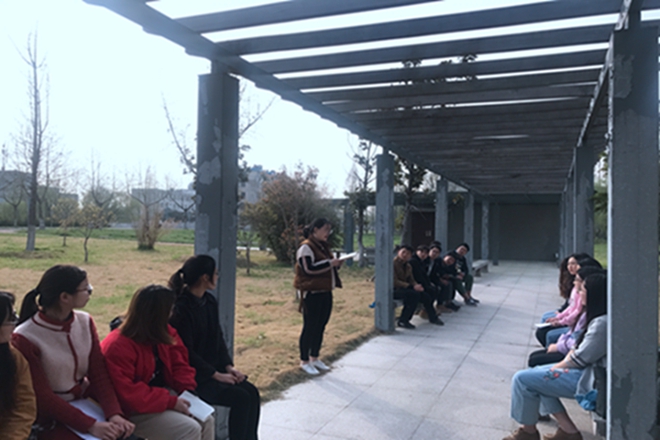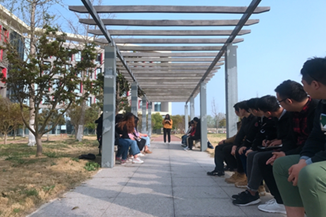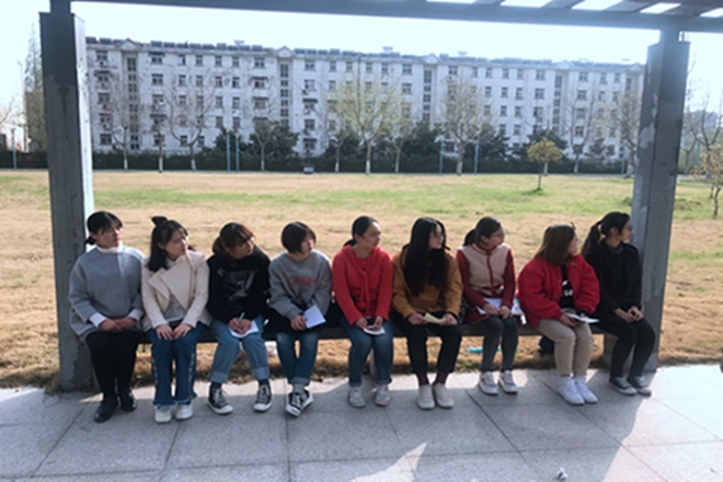 4月11日,在音乐楼前的走廊上,1501团支部的全体同学集中进行“与总理的故