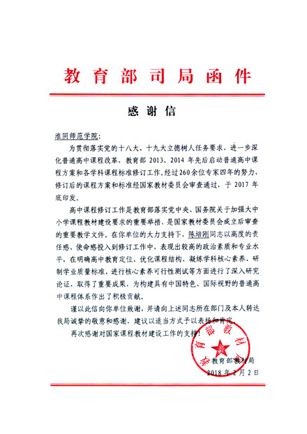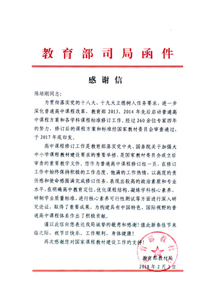 近日,公司收到了来自教育部教材局的专电感谢信,信中就公司教师陈培刚博士参加教育部《普通高中课程标准(2017版)》研制工作,向公司及其本人表示诚挚的敬意和感谢。