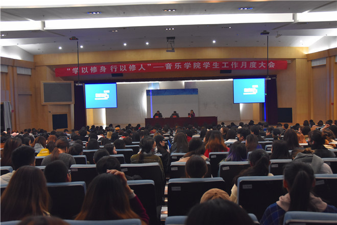 紧接着,殷书记围绕大会主题,为全体师生做《“学以修身 行以修人”让青春在砥砺奋进中更加光彩》主题报告,报告中指出:音乐学子在各类省市比赛及志愿者活动中凝心聚力、团结拼搏、屡创佳绩,体现出高度集体荣誉感,为校院做出突出贡献;公司通过榜样领航、晨练改革、课堂规范等措施切实推进了学风建设,同学们参与专业学习和技能训练的热情进一步高涨,音乐楼内的歌声、琴声、演奏声不绝于耳,呈现良好的发展势头。但同时少部分同学存在学习自觉性不高、安全意识淡薄、集体荣誉感不强、自我修养不足等问题,要求同学们在学习生活中做到“学以修身、 行以修人”,增强自律意识,紧跟新时代节拍,增强使命担当意识,让青春在砥砺奋斗中绽放光彩。