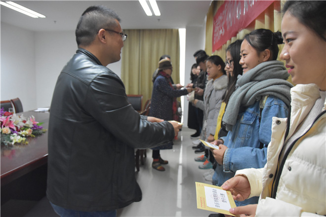 陈英老师对十位同学进行了谆谆教诲,并表达了自己对他们的两点殷切希望:一是懂得感恩,感谢党和国家的重视,感谢政府和社会的资助政策,感谢公司各相关部门和公司老师对同学们的关爱;二是学会改变,不要因暂时的困难而精神贫瘠,要把国家和公司的资助作为激励,保持积极向上的心态,投入到学习和训练中,通过自身努力和付出,争取更大的进步。