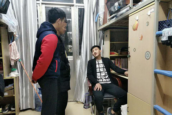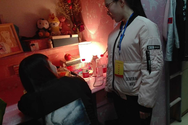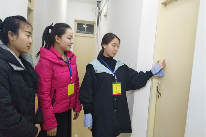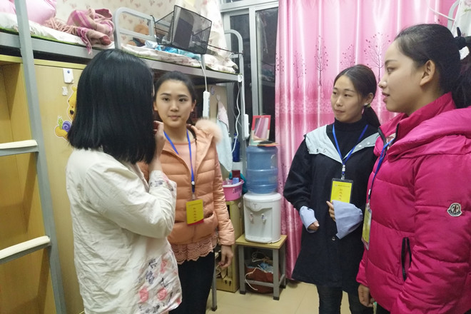 志愿者们照例在集中地点点名,分发志愿者工作证,开始宿舍卫生、晚归、大功率电器检查。志愿者们在宿舍里和成员们亲切的交谈,提醒他们用电安全,对宿舍大功率电器进行排查,对整个宿舍的卫生情况提出整改意见,逐一询问宿舍同学晚归原因并登记。