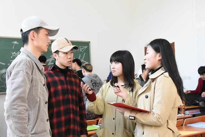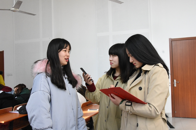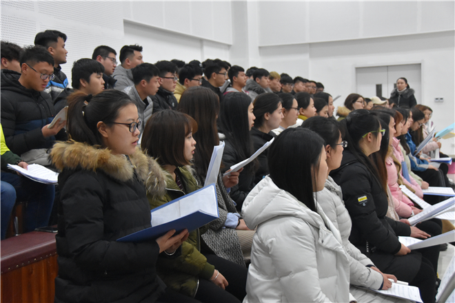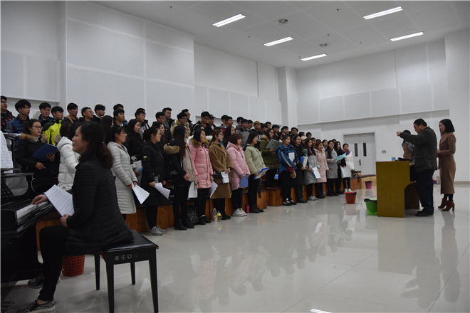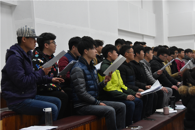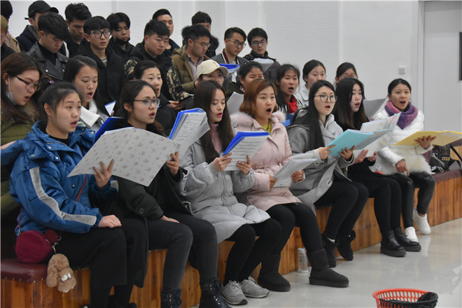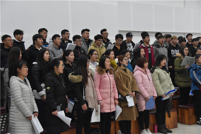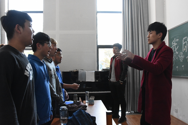 在本次采访中,我们还采访了合唱团的团长耿苏阳学长,我们问他,在同学们的排练过程中有遇到哪些困难,对同学们在排练中勇于担当的表现,有什么话想对他们说?他说:“排练中,困难是必不可少的,因为只有困难才能锻炼我们的意志,我们应该是在困难中磨炼自己。最近天气变化无常,不少同学都生病了,要知道这对唱歌来说简直是致命,但是同学们依然在坚持排练,即使不唱歌,但也在认真思索琢磨老师所讲的方法和注意点,我想这应该就是担当吧,因为合唱需要所有人的思想统一,这样才会出现美妙的声音,如果有一个人不在,那意味着老师所讲的内容要多说一遍,所以,我很幸运在合唱团如此奋进的大家庭中。”