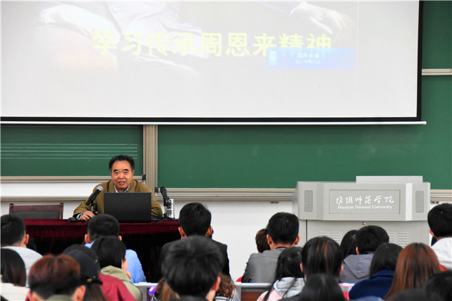 紧接着,王教授对周恩来精神做全面总结,他认为:“周恩来的精神风范比思想理论带来的影响更为重大”,还提出“六无六有”全面诠释周恩来精神核心——甘当公仆。他强调恩来精神的内涵主要体现在三个方面:1.为人民的长远利益出发;2.为人民的现实利益而操劳;3.为人民的根本利益而献身。最后王家云就如何传承恩来精神向同学们提出四点要求:1.与参与实现中国梦相结合;2.与践行社会主义核心价值观相结合;3.与感知淮师精神相结合;4.与创建周恩来班相结合。