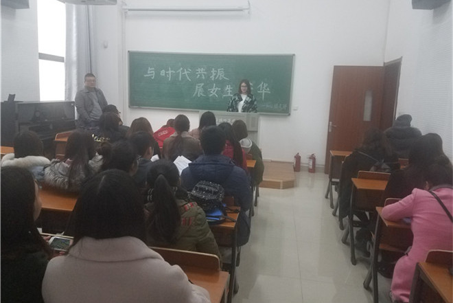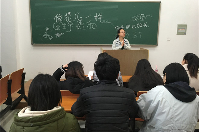 青青子衿,愿舞我生。1405班以充满青春活力的舞蹈和风格特异的民族舞拉开女生节帷幕,女生们的舞蹈展示着无限魅力,感染着每一位同学。1502班女生将自己的愿望写在纸灯上,放飞心愿灯。“幸福”“健康”“考研顺利”等等真挚朴实的愿望,有着对亲人朋友的祝福,也有对未来的期待。1608班女生们来一场浪漫的桃林邂逅,同学们兴奋的在桃林间展示自己的优美舞姿,旋转、跳跃感受着独属春天的浪漫气息。你本来就很美,1606、1607班举办“我眼中的你”活动,女生通过倾听别人口中描述的自己,发现自己比想象中要美,变得更加自信。冰雪净聪明,才韵心中含,1505班女生或三或两聚集在一起,阅读着她们喜爱的书籍,畅聊读书心得,展现丰富学识。勤学善思,追随榜样,1501班同学们一起挑选班级里女生的优秀课堂笔记进行分享讨论,共享学习经验,提升学习能力。最美风采,纯纯关怀,1605班女生们互相化妆,分享能够提升妆容的小窍门,他们认为内外兼修的女生才称之为“最美女生”。1402班组织“与时代共振,展女生芳华”交流讨论会,号召女生自尊自信,自立自强。风流尔雅,惠心自持,1504班在篮球场进行最美的你、心语心愿、童年回忆多项活动。