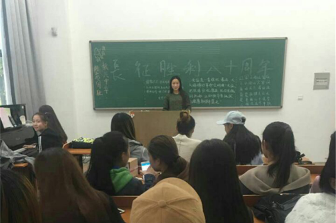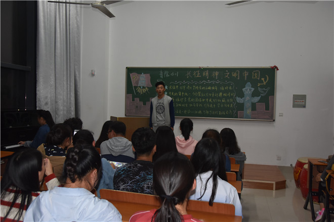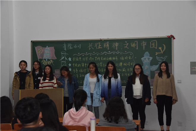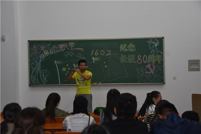缅怀革命先烈,传承长征精神,接过时代的接力棒,奋勇向前。1602班的同学积极宣传长征精神,在班级中营造学习长征精神、继承革命传统的良好氛围,以此纪念红军长征胜利80周年。22日晚,同学们在音乐楼A1-102教室,以诗歌朗诵的方式歌颂长征精神,推动长征精神的深入学习。
