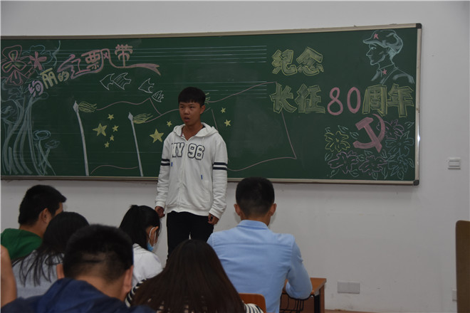 长征精神的学习是持久的,是必须的。长存于心,征始于行。此次纪念长征活动80周年团日活动,让同学们深刻认识长征精神的内涵,激发同学们的爱国情怀。1608班孙军同学说:“革命先辈在长征的英勇顽强正是我们大家学习的榜样”。