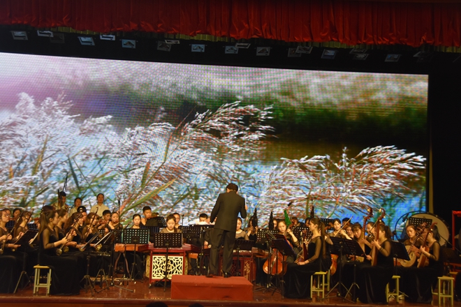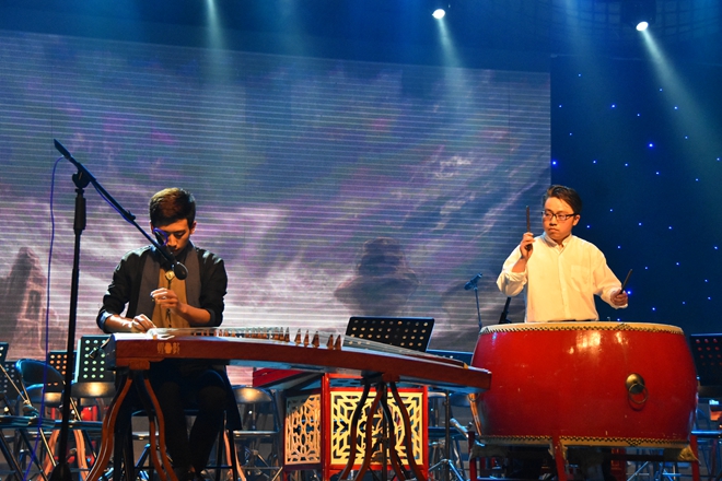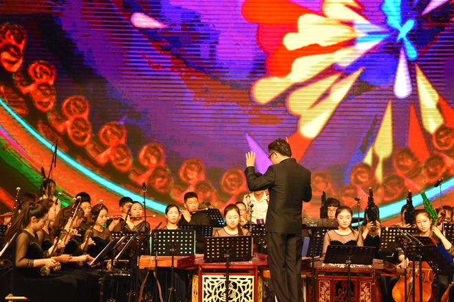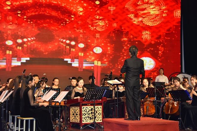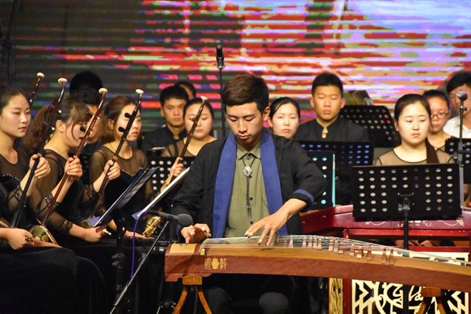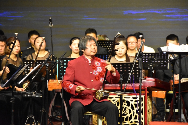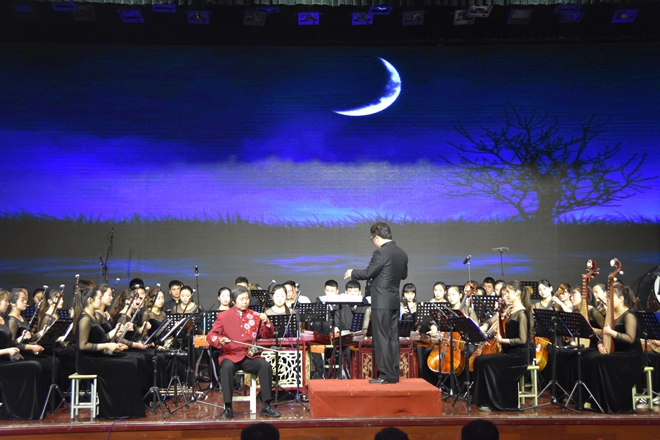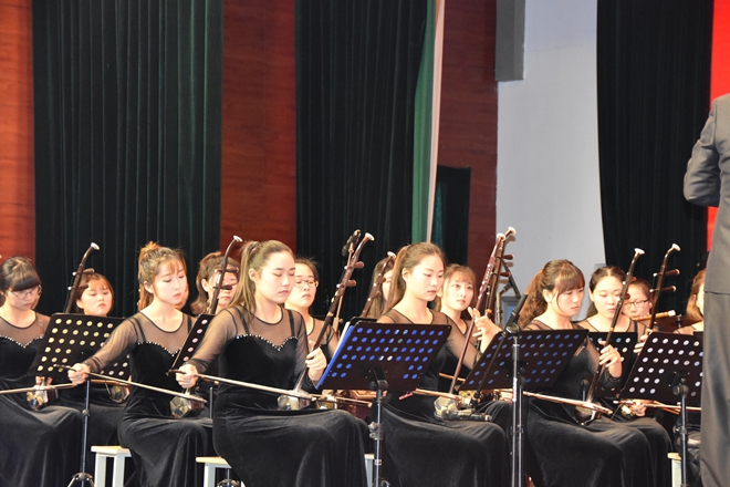 一首由南京艺术公司程才老师创作的民乐小合奏《书香》唤起曾经十年寒窗的我们,风华正茂,意气风发的青葱时代;一首由印度民歌改编而成的民乐合奏曲《五彩缤纷》展现民族乐器强大的包容性和世界性;郑怀佐老师演奏的一首由中国民间音乐家华彦钧创作的民乐作品《二泉映月》,不仅表现全曲忧伤而又深邃的意境,流露出伤感和愤慨的情绪,更显示中国二胡艺术的独特魅力,寄托阿炳对生活浓浓的热爱和憧憬。全曲主题时而沉静,时而躁动,赋予了整首曲子深沉而又激扬的艺术风格。紧接着,大一员工杨景宇同学自己创作的古筝独奏曲《夜刺楼兰》,跌宕起伏,陡然呈现紧张氛围,让我们感知到那个懵懂少年执着而鉴定的步履和一往无前的身影;优美动听的《拔根芦柴花》以其舒展自由的节奏,明亮悠扬的音调紧接其后,展现洋溢着欢乐的劳动气氛;中国味十足的《霍元甲》、气势磅礴的《大圣传奇》、深沉激昂的《火影忍者》,是民族乐器和现代音乐的完美结合,把现场的气氛推向高潮;著名竹笛演奏家张志刚老师用一首热情明快的新派笛子代表曲《扬鞭催马运粮忙》将观众引入曼妙的音乐世界,生动朴实的音乐语言,牵绊住在场每个人的心,都被他那独特的台风深深感染;一首充满异域风情的《丝绸之路》结束此次表演,为演出划上圆满的句号,在场的观众更是对演员们报以经久不息的掌声。