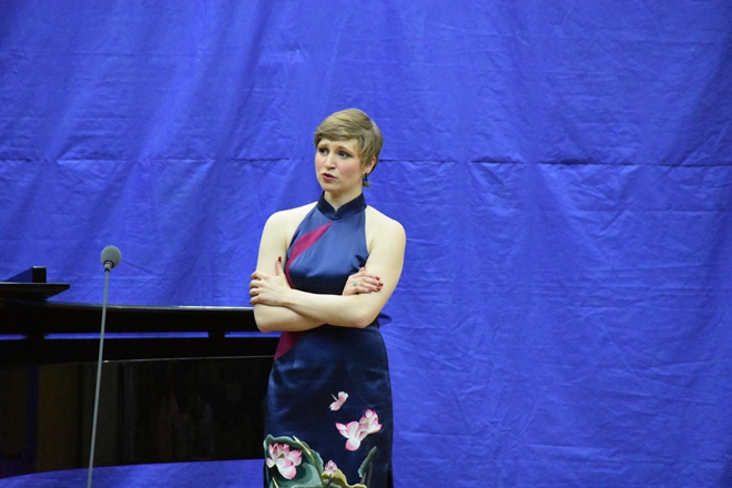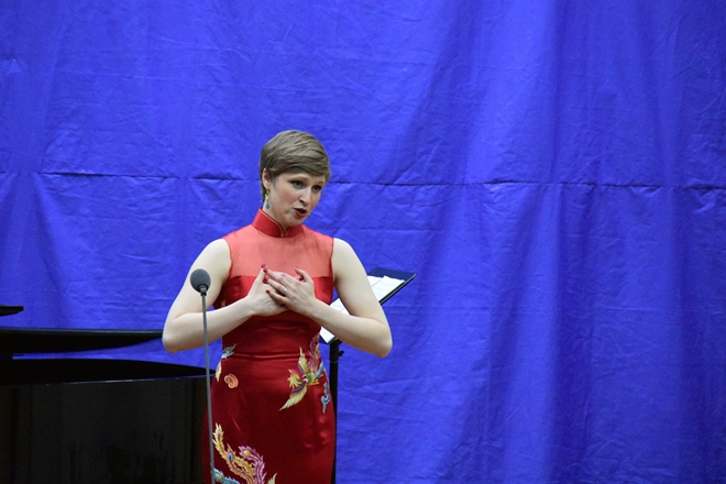 音乐会下半场朱丽叶演唱丁善德作曲的声乐套曲《滇西诗抄》,这些歌曲充满中国音乐的元素,又结合作曲家们所受到的西方音乐教育的影响,给观众们留下深刻的印象。朱丽叶对中国艺术歌曲细腻而深情的演绎,使现场一片沸腾,掌声不断。伴随着朱丽叶优美演唱的,是艺术指导邱怡丝丝入扣、配合谨密的钢琴伴奏。在节目之中,邱怡还提供专业的介绍与讲解,给观众一个更深入了解的机会。