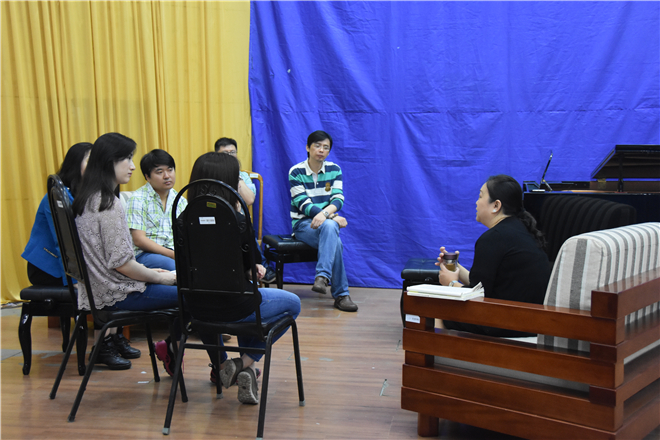 邱怡老师与现场的各位教师分享自己多年积累的教学经验,并作出示范。邱老师指出要用心感受歌曲音色、音质、力度强弱与内心情绪的变化。每个人对歌曲的理解不同,演绎的歌曲风格也不同,但是要达到规范、通畅、自然的歌唱状态,在艺术歌曲中需要对柔、轻、弱的地方用心控制。