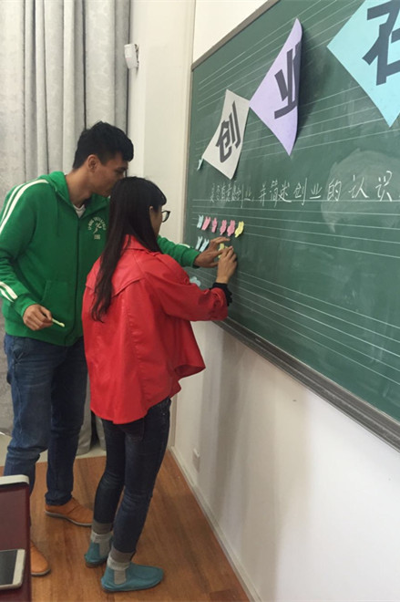 活动内容分为两个流程。其一,论创业。就自身而言,对是否有意愿创业作出选择,将纸条贴到黑板上指定区域,并简述自己选择创业或者不创业的理由,众人踊跃参与讨论,并积极发表各自观点;其二,悟团结。大家来到音乐楼前的空地上,一起做群体游戏,让大家在游戏的每一个环节中体会无论选择哪条路唯有团结、互帮互助才能获得成功,众人拾柴方能焰高火旺。