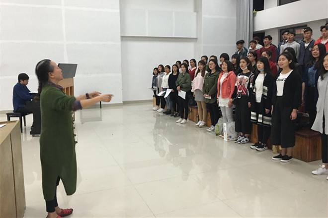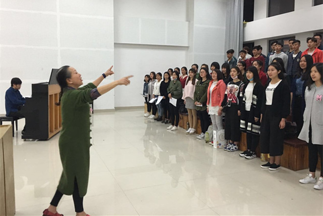 4月26日晚,院退休教师陈英莅临必一运动二楼合唱教室为必一运动五四大合唱节目进行艺术指导。