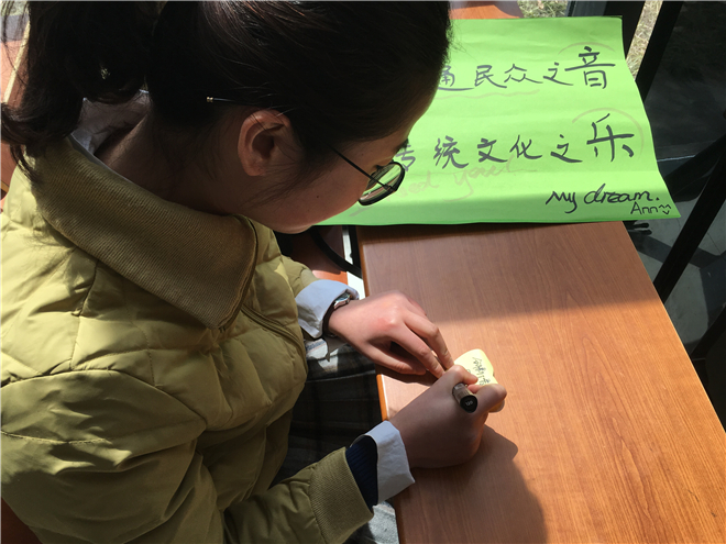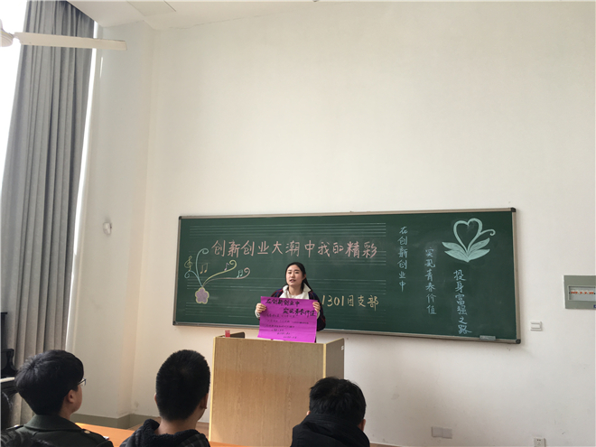 活动进行到第二项,团支书耿儒博同学分别邀请几位同学,写出创新创业思路想法:李赫同学的“在创新创业中,实现青春价值”,向同学们表明了创新创业之于青年老员工的重要性;丁安宁同学的“创普通民众之音,新传统文化之乐”,是从自身专业角度出发,为传统艺术文化增添新色彩;郭敬同学则是从多方面分析阐述了创新创业的类型,生态、养生、废物品再利用等等方面。通过这几位同学的思考分享,同学对于创新创业有了更多的认识与思考。