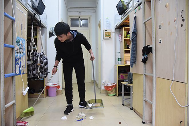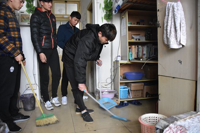4月6日下午,公司党委副书记殷成志和学工办副主任郑建春老师分别带领15级男、女同学去毕业班宿舍打扫卫生。争做文明新人,创建和谐寝室,营造友爱氛围。