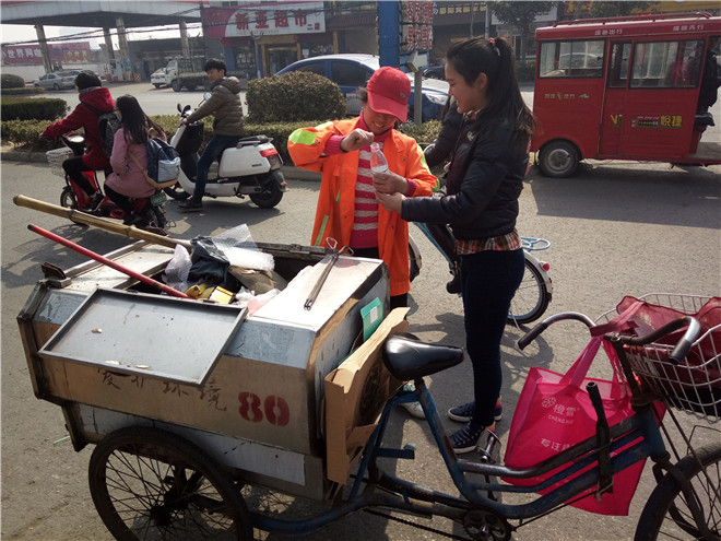口干舌燥,志愿者马越超搬来了饮用水给大家,大家纷纷送给环卫的叔叔阿姨,马乐超说:“今天我们才干了一上午就很累很热,叔叔阿姨们日复一日,年复一年,不论寒冬酷热都在街道上打扫,他们才是最辛苦且最值得尊敬的人。我们要珍惜环卫工人的劳动成果,这是志愿学子们的号召,也是雷锋精神最美的体现。”