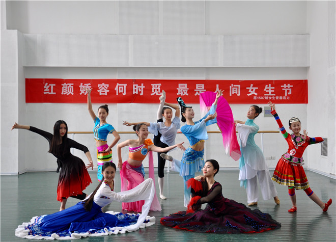 美丽永远是女孩们所追求的,来自1507班的美妆达人王心怡同学开启化妆秘籍分享课程,画上美丽的妆容,换上少数民族服装。五十六个民族,哪一族女生的美丽惊艳到了你?五十六个民族五十六种美。1502团支部女生则挑出自己最心仪的照片,并写上留言,期待遇见更美的自己。1405班的女生们穿着舞蹈服,喊着甜甜的口号“一生献给舞蹈,今天献给女生”,做最美的自己。美在淮师,醉在音院。
