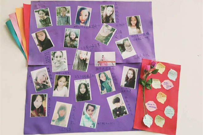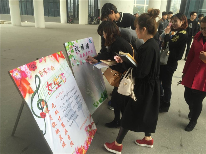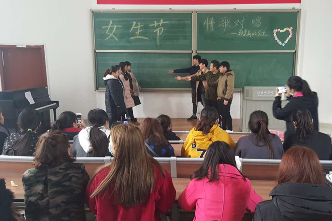 “你许愿我实现”,1402班女生们在红色卡片上写下自己心中的小愿望,写在彩纸上,由男生负责抽取并实现女生的愿望。伴着心中的小小期待,传递着满满的快乐。1403的男生说要给女生们一个惊喜,每人买了一朵红玫瑰,献给他们班的女生,“平生纵有青云志,今日甘为裙下臣”。1406的男神们早早为“女王们”买好了蛋糕,在温馨的布置中,同学们在烛光中推门进来对着蛋糕许愿,一起吹灭蜡烛,庆祝女生节。 1504、1505班的同学们开展“情歌对唱——致美丽的公主”活动,“对面的女生看过来 看过来”,欢快的旋律,挥动的双手,记录着我们青春美好的记忆。