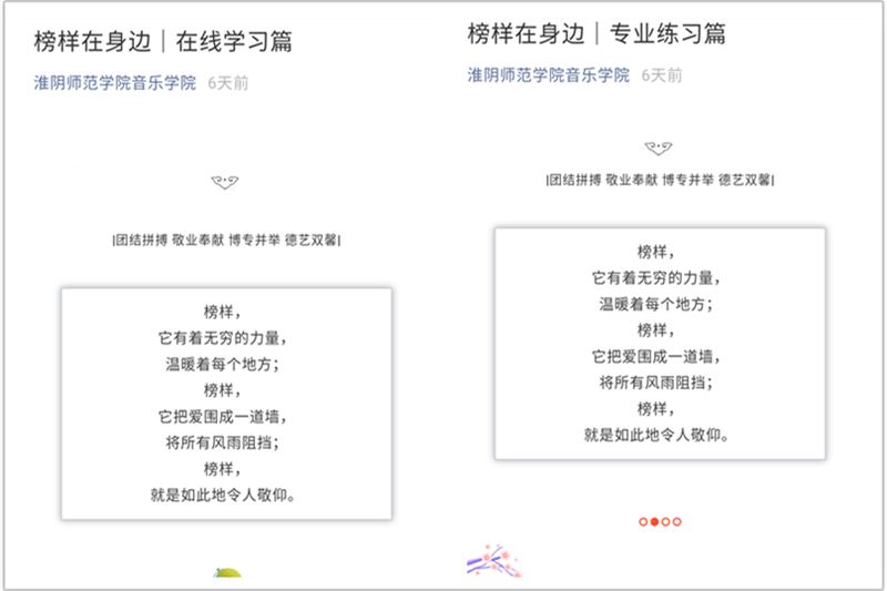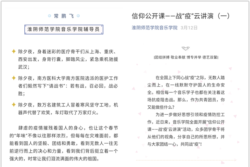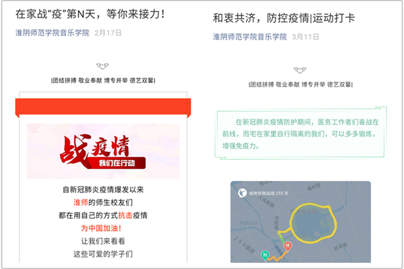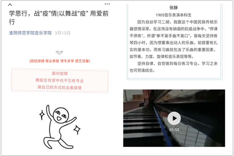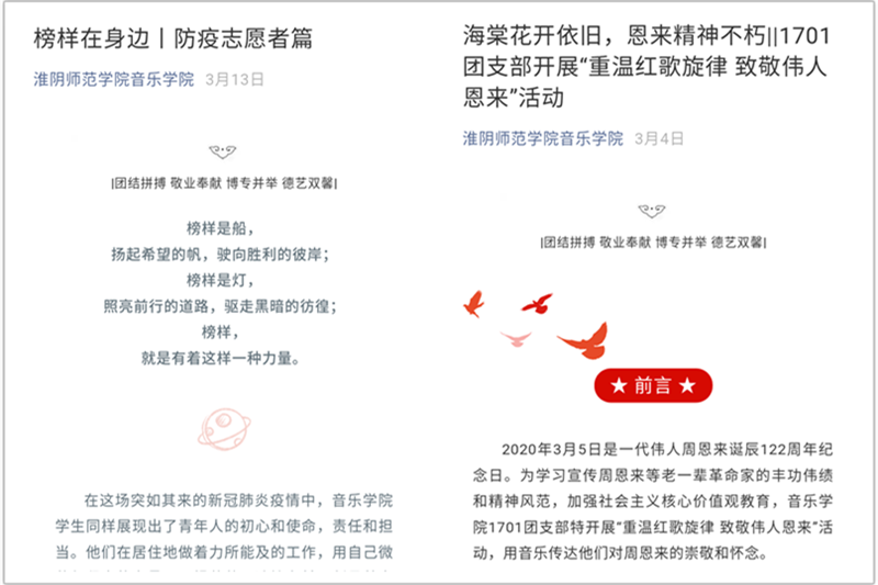 发起一次学周践周志愿服务。鼓励员工积极参与所在地的防控抗疫志愿服务活动,并通过线上经验分享,在实际行动中弘扬恩来精神,彰显淮师学子的昂扬风貌与青春力量。结合专业优势,开展“重温红歌旋律 致敬伟人恩来”红歌颂唱活动,在红歌传唱中重温革命荣光,感受伟人情怀。选树一批榜样典型。征集员工在家线上学习与练功的笔记、心得、图片和视频,借助 “在线学习”“专业练习”线上分享,充分展现同学们在疫情期间“停课不停学”的积极风貌,引导员工积极学习,提升自我,并为同学们提供一个展示优秀典型、交流学习经验的平台,激励同学对标榜样典型,增强专业能力。