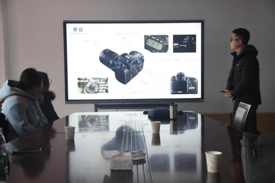 唐老师为同学们做的培训内容主要包括:如何正确的使用单反,构图方法以及使用技巧。 唐老师一边用多媒体为同学们讲述单反相机的结构、使用技巧、构图技巧,一边拿着单反相机耐心的指导员工们。他还指导员工在不同场合下应该怎样拍出合格的照片。例如在小会议室、大会议、室音乐厅这种地方应该如何取景。唐老师不仅让同学们了解了全景、中景、近景的区别,还讲解了小光圈、大光圈、焦距等原理。最后,唐老师为同学们讲述了拍特写人物需要注意的方面。讲道:“拍领导人员视察的时候尽量顾及到他左右的考察目标。拍校领导讲话的时候要着重注意镜头,确保面部无遮挡物……”。