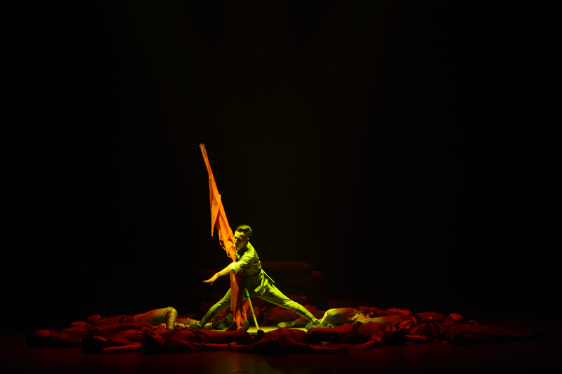 其中,舞蹈《战旗》是一部演绎着血雨腥风的年代,一群执着的人为了理想、信念,不怕牺牲,不怕挫折,一步步走向胜利的奋斗史,在一次次的战斗中,沉着指挥,在紧迫之中流露冷静,在一次次的战争中战旗不倒,红军英魂永垂不朽。