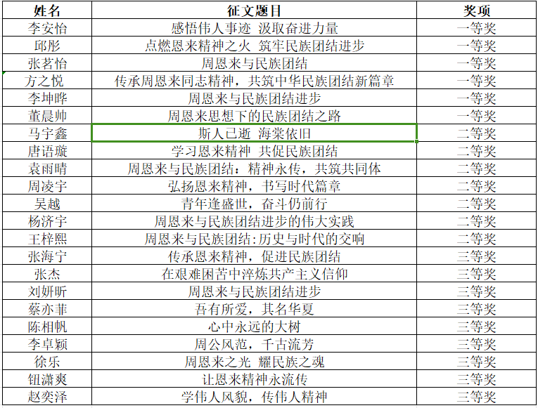 为进一步加强铸牢中华民族共同体意识宣传教育,深化师生对周恩来同志的民族团结思想以及对铸牢中华民族共同体意识的意义和价值的理解,必一运动组织开展周恩来与民族团结进步主题征文活动。活动共征集作品70份,经过评选,获奖名单如下: