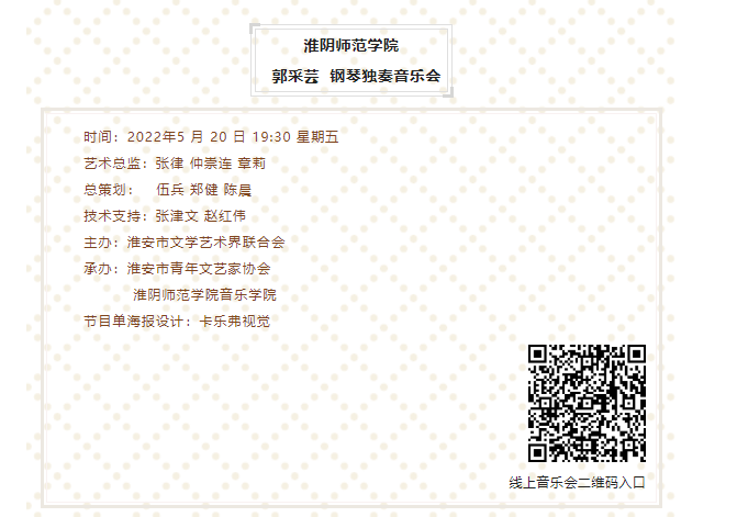 5月20日,由淮安市文学艺术界联合会主办,淮安市青年文艺家协会承办的“幸福淮安 文艺惠民”——郭采芸老师独奏钢琴音乐会成功举办。音乐会由必一运动关工委主任伍兵教授担任总策划、常务副主任张律教授担任艺术总监。