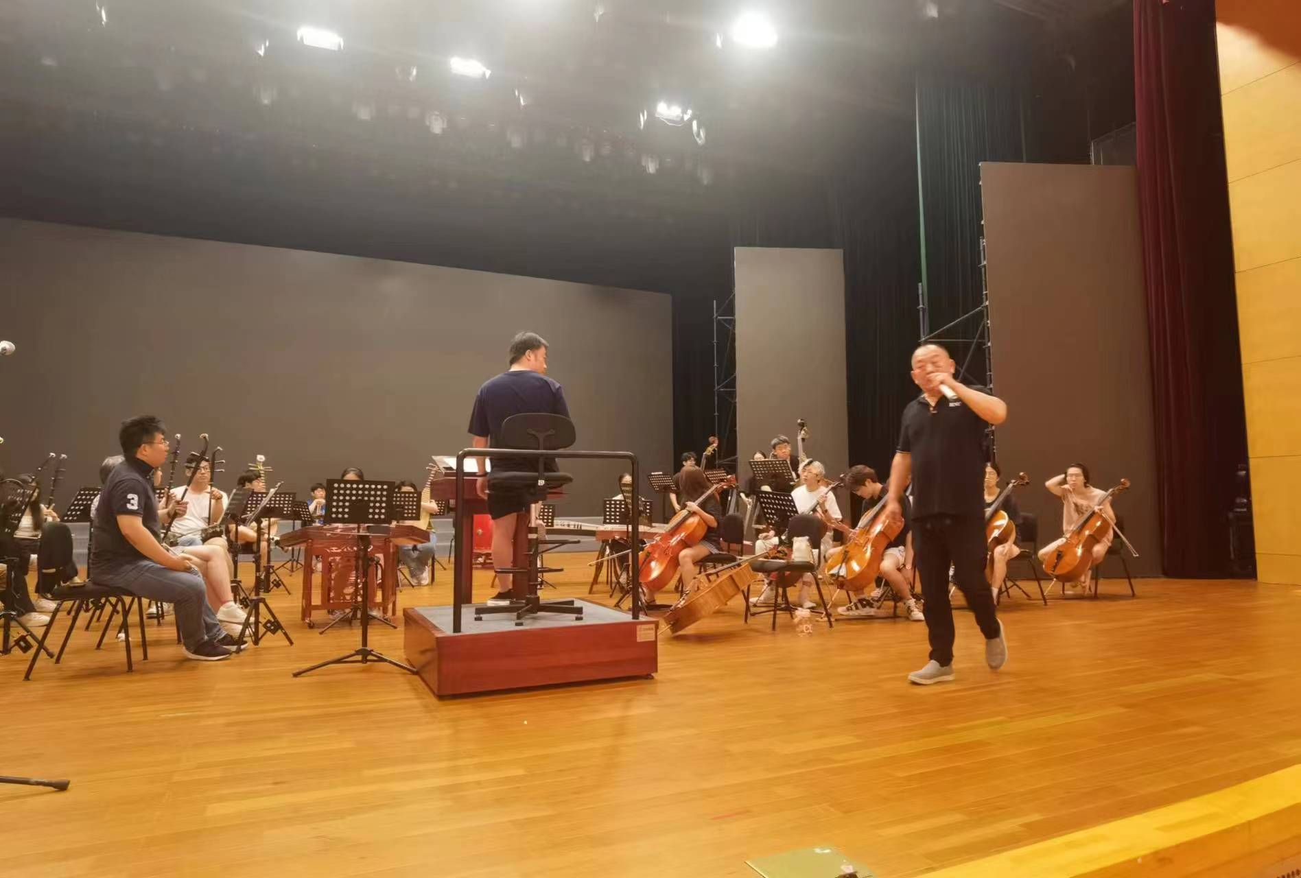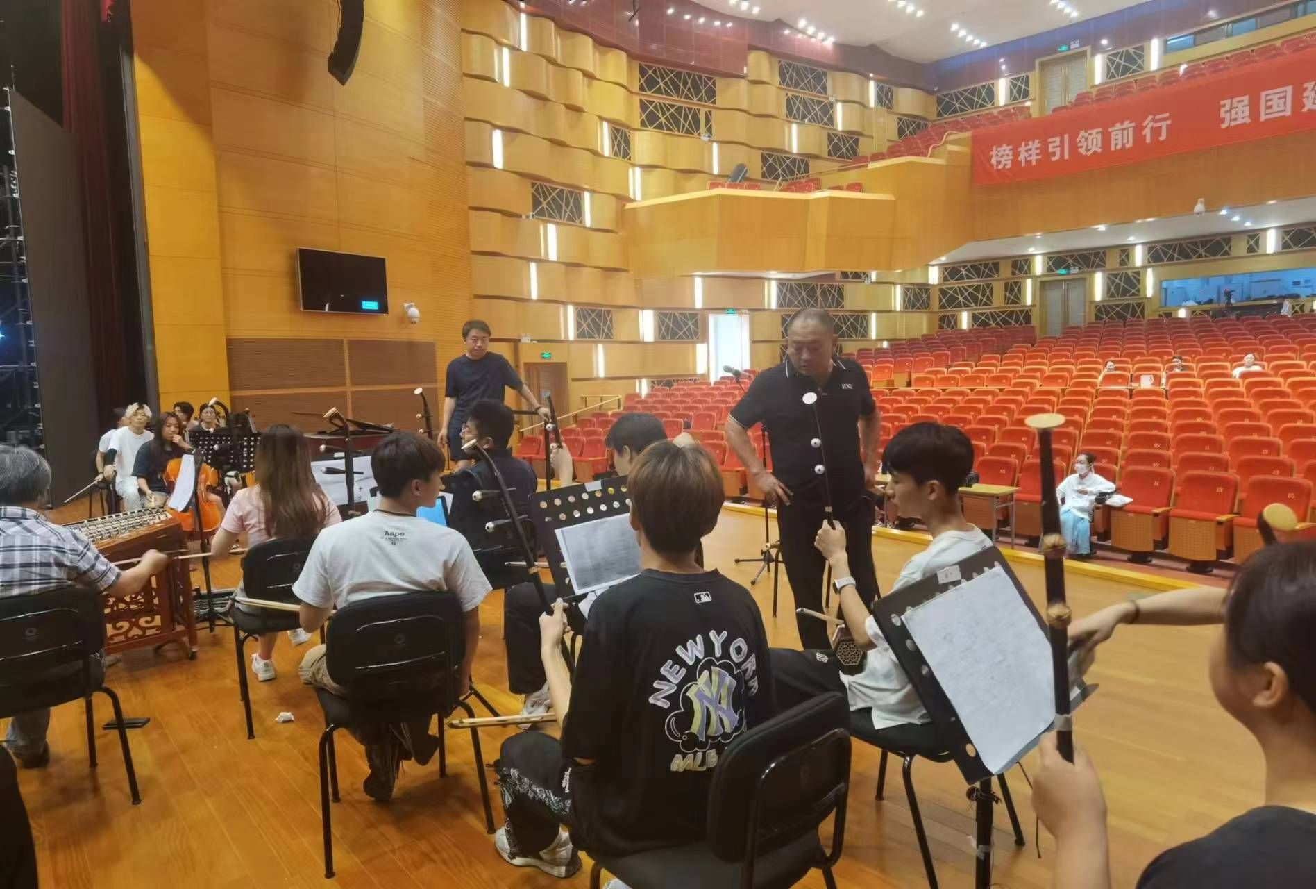张律教授指导乐队的队形、坐姿和舞台灯光设计,对部分同学的演奏进行细节点拨。他还鼓励民乐团成员们团结一心,用心演绎,他讲述了音乐的流动美,只有全情投入才能诠释手中所演奏的作品。幽默风趣地语言使民乐团成员们感同身受,有效提升了排练的效率和质量。