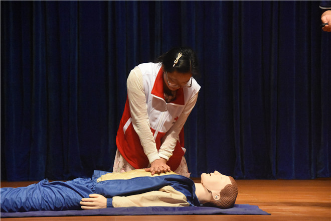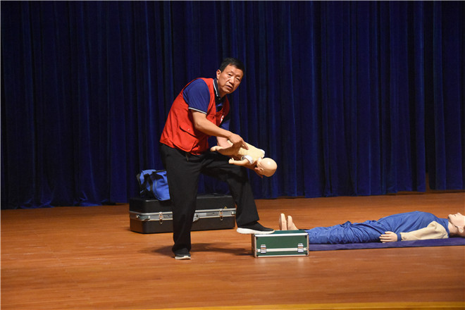 讲座开始前,老师通过ppt和播放视频资料让同学们了解到遇到突发紧急事件时,应该怎样正确处理事故。随后,向同学们详细的讲解一般伤害及事故现场的处理方法并着重强调气管异物阻塞的急救方法同时邀请台下的一位男同学进行急救演示,让同学们直观地感受到事故发生时的紧迫性。老师通过分享真实案例让同学们认识到突发事故防治的重要性,并且还提到一些特殊伤害的急救方法,如危险品、化学品不慎入眼,应尽快打半盆清水,将头埋进水里,不停眨眼。最后,老师给同学们介绍几种现场救护的方法,如心肺复苏的八个步骤、胸外按压和人工呼吸。并邀请几位同学上台演示人工呼吸与胸外按压的正确示范动作,使同学们对急救的方法技能更加明了熟练。