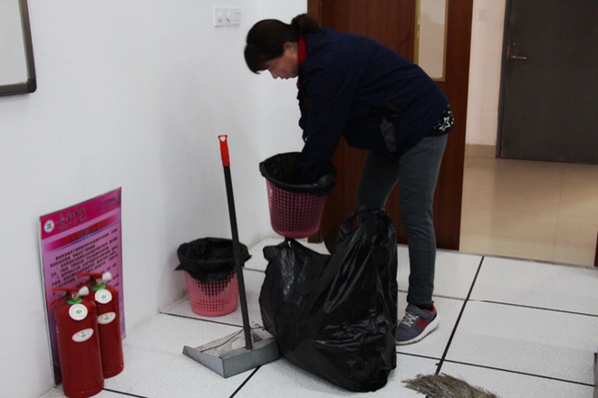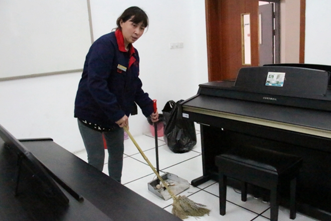 阿姨:“我们的负责区域分工比较明确,大部分同学都比较自觉,所以工作上不算十分辛苦。但仍部分员工在我们提醒后还明知故犯,比如车辆经常不能够停放在正确位置和琴房的垃圾不自行带走,在教室吃的食品包装等随意丢弃等,在无形中增加了我们的工作量。”