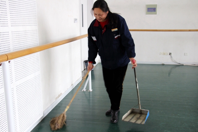 阿姨:“我们负责必一运动的保洁工作。具体就是扫地拖地,打扫舞蹈练功房、钢琴房、电钢教室以及停车场的车辆摆放等等。”