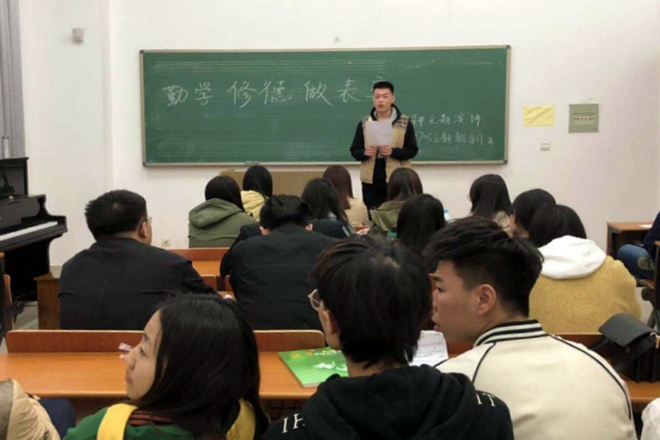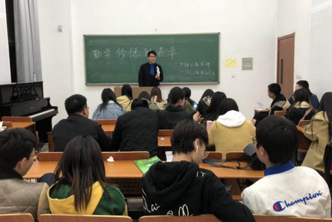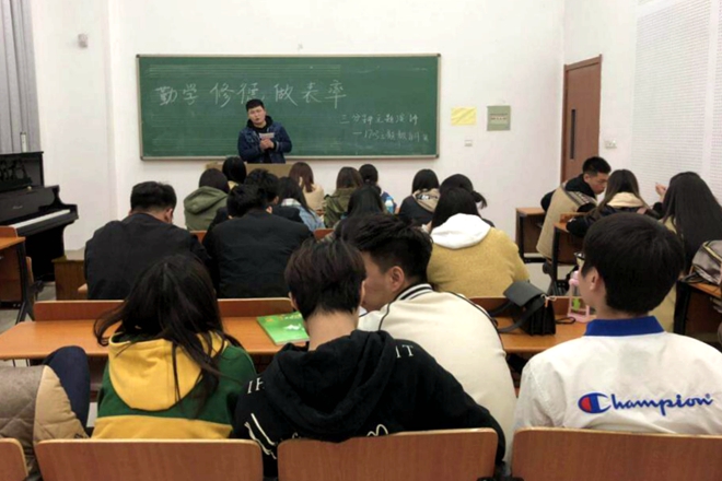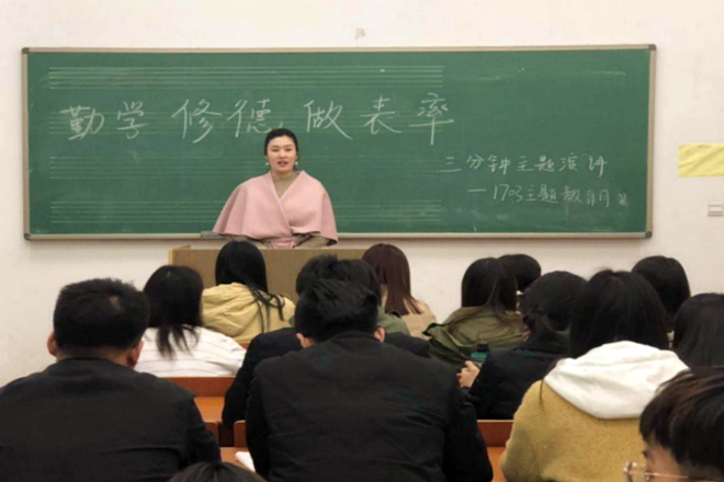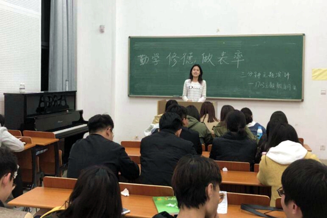 为推进主题教育月开展,1703班于4月3日在音乐教室以“勤学、修德、表率”为主题举行三分钟演讲。