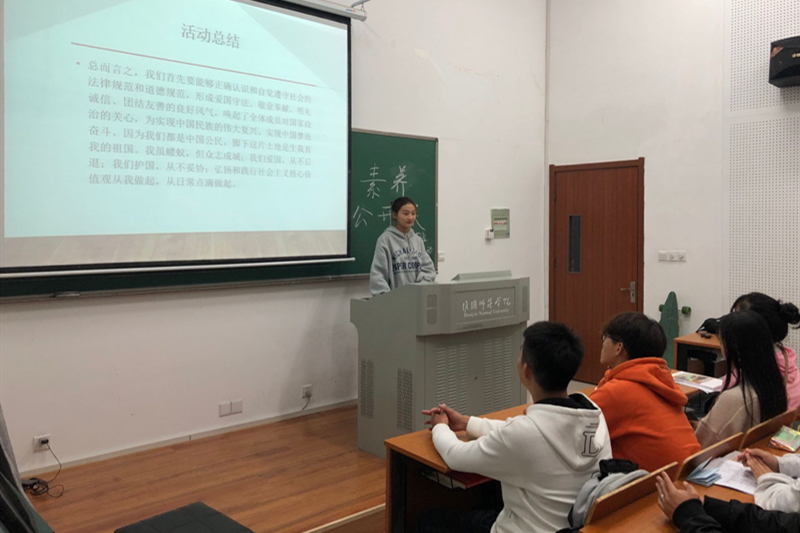活动开始,团支书魏紫怡就社会主义核心价值观的内涵做了全面地介绍,并细致分析社会主义核心价值观的实践要求。接着,班级同学自发上台阐述自己对社会主义核心价值观的体会和感悟,台下同学踊跃回应,活动互动频繁热烈,极大触动了同学们的参与热情。最后,魏紫怡对活动进行总结,进一步深化活动主题,与同学们分享自己的心得体悟,激励同学们敢为人先,奋发进取,积极实践社会主义核心价值观。