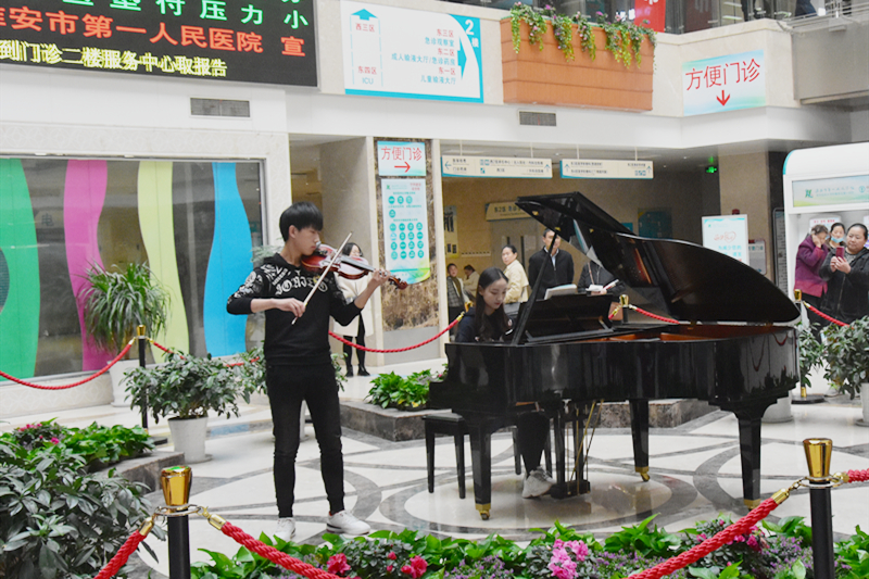 志愿者们在一院门诊大厅音乐角为患者和家属献上丰富多彩的音乐节目。小提琴曲《萨拉邦德舞曲》《沉思》《爱的礼赞》,钢琴曲《雪之梦》《爱的旋律》《海边的祈祷》,合奏《我和我的祖国》等一首首舒缓优美的旋律,在门诊大厅中飘扬。等候就诊的患者和家属纷纷驻足聆听,柔美的曲调,舒缓的节奏,抚慰着患者和家属的焦虑情绪,给予患者和家属别样的精神力量。最后,精彩的演奏在热烈的掌声中结束,音院学子热心奉献的志愿精神和深厚扎实的专业素养受到现场观众的一致好评。
