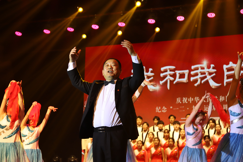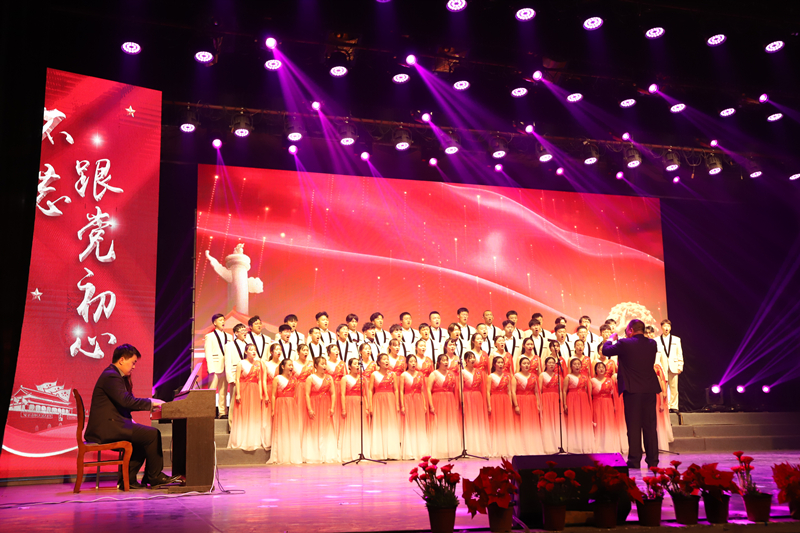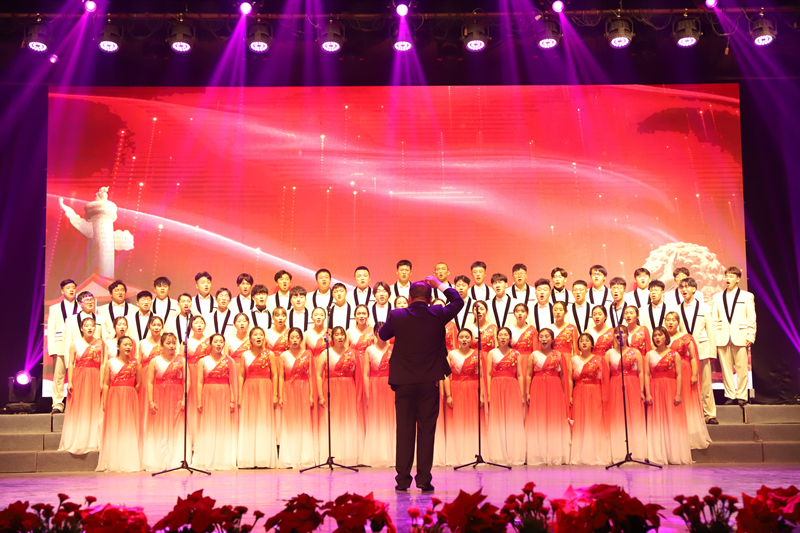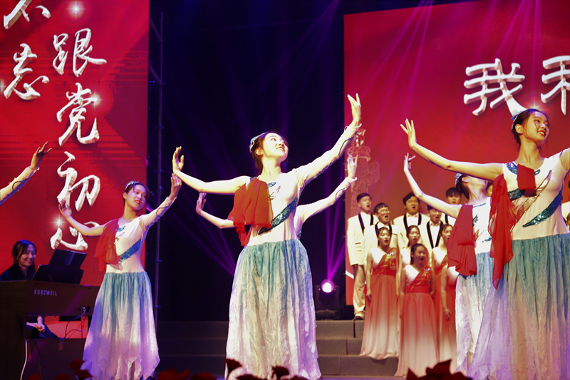 “收获理想,收获理想的共产人”在一片充满希望与奋进的歌声中,公司精心编排的合唱曲目《又唱格冬代》在优美舞蹈的配合下完美绽放,展现了共产党人初心不改,不辞辛劳,终获理想的辉煌历程。紧接着,《我和我的祖国》的动人旋律在大礼堂中响起,公司师生饱满的爱国情,炽热的爱国志,激发了现场观众对伟大祖国的浓浓爱意,台上台下的爱国激流汇聚在一起,全场观众起立合唱,红旗挥展,气氛达到高潮。