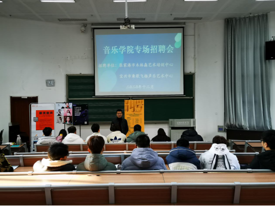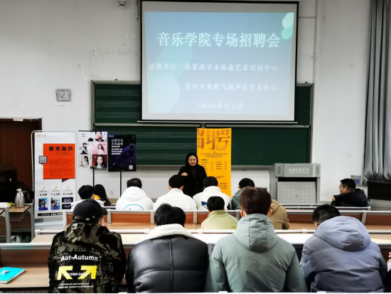 本次招聘会首先由木林森艺术培训中心范经理以及宜兴市乘歌飞扬声乐艺术中心的刘老师向在场的同学介绍了公司所在地张家港的基本情况,接着放映了本校的视频宣传片,展示了中心的办学理念、薪资待遇和工作岗位设施条件,随后对本次招聘的岗位和要求作了详细的介绍。