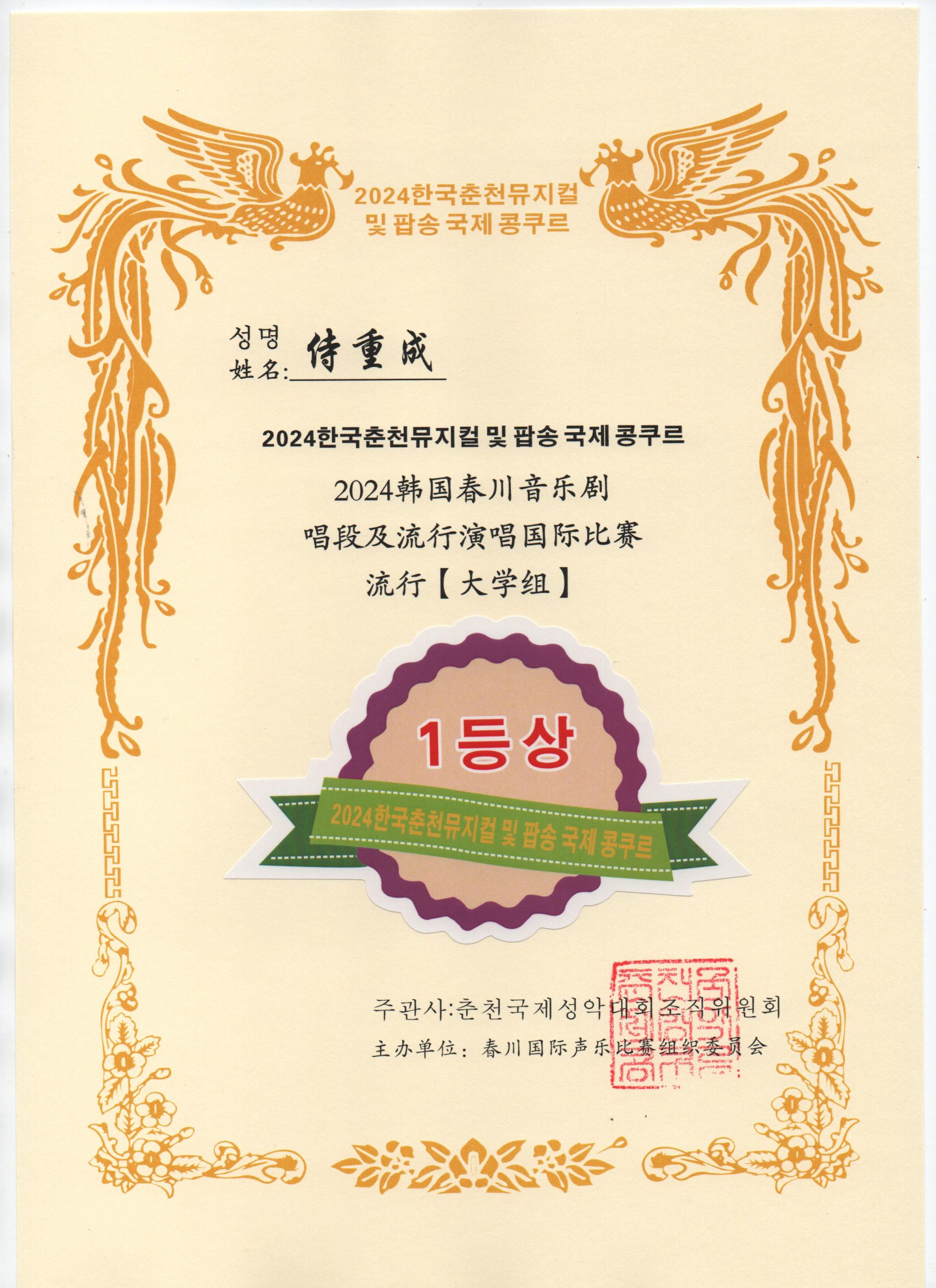 个人简介:侍重成,男,汉族,江苏连云港人,本科学历,共青团员,淮阴师范公司必一运动音乐表演专业2205班员工,现任班级班长,曾获校一等奖学金四次,三好员工两次,获第十二届“韩国·春川”国际声乐比赛音乐剧唱段及流行演唱大学本科组一等奖、韩·中国际声乐比赛大学本科组二等奖、江苏省第七届老员工艺术展演乙组(独唱)三等奖,连续两届江苏省流行大赛“新莺奖”金奖,获校老员工年度人物—文体才艺之星、淮安老员工开学典礼优秀志愿者等校级及以上荣誉四十余项。