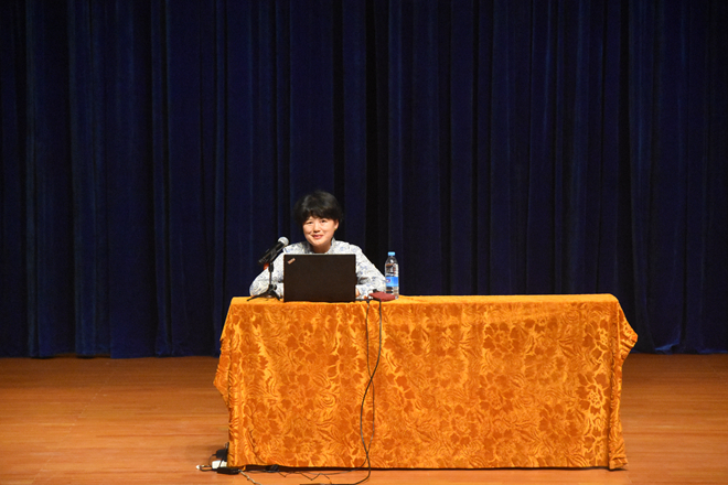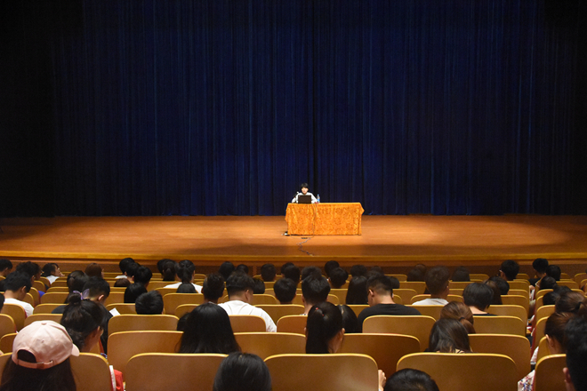 请校心理中心于玲玲老师在音乐厅为全体新生进行心理健康教育讲座。