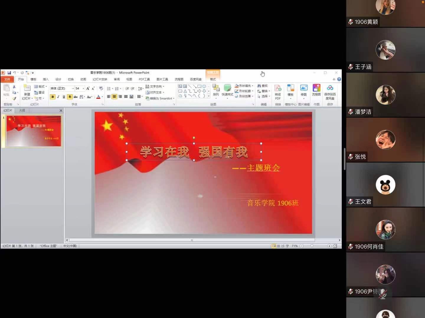 线上我们以ppt的形式继续加强“学习在我,强国有我”的主题学风讨论,同时对我们正在开展的线上教学工作问题进行纠察和改正,提高线上上课效率,加强班级同学认真学习态度,改正不良班风,让优良班风学风带动班级同学共同进步!