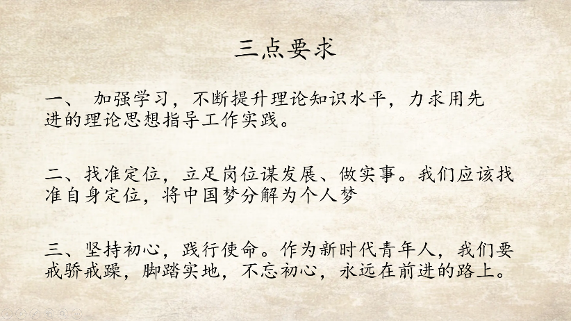最后介绍了我班团主题活动学习情况,列出了三点要求。一是加强学习,二是找准定位,三是坚持初心,践行使命。
