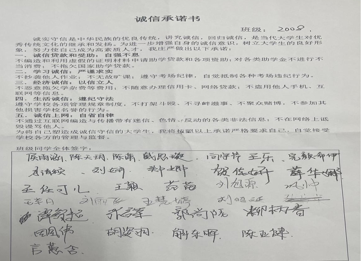 (九)签订诚信承诺书。公司组织20级、21级、22级在校生签订诚信承诺书,帮助同学们树立、承诺起“做诚信人、说诚信话、做诚信事”的诚信观念,规范个人行为,珍视诚信价值。